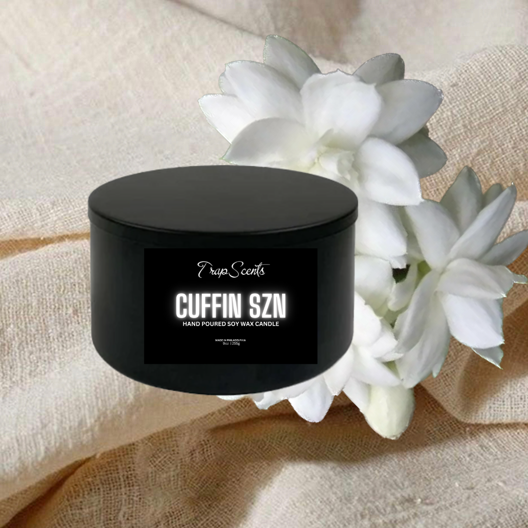 Cuffin Szn is a premium candle, hand-poured with natural soy wax and a soothing blend of jasmine flower and clean linen. Its aroma will surround you in a warm and calming atmosphere, perfect for any home.